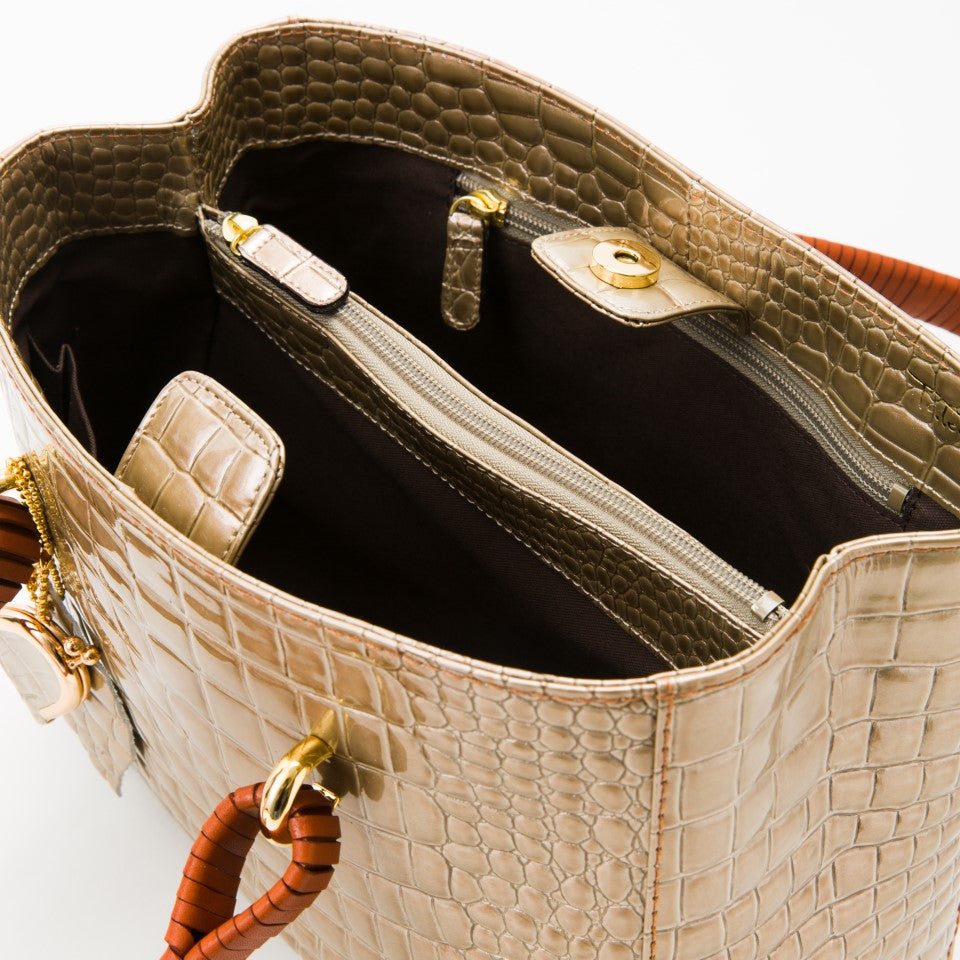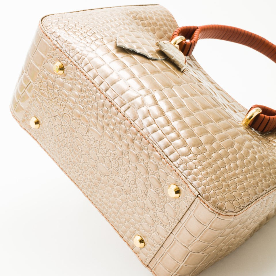 創業から55年以上バッグのアップデートを繰り返してきた鎌倉高野を象徴するアイテムで、おでかけやイベント、通勤で持つ方をエレガントに彩ります。フォーマルバッグを作成する職人の技術から生まれるシンプルながらふっくらと可愛らしいシルエット。贅沢で存在感のある持ち手は、ヌメ革を細く裁断し、一つ一丁寧に巻きあげています。ゴージャスな金具、持ち手と同じ色のステッチなど細かい部分まで作りこみました。意外と収納にも優れており、ファスナー付きの仕切りと携帯・小物仕切りで大事な小物、すぐ取り出したいものを分けて収納できます。大人のオシャレを楽しむ方におすすめのハンドバッグです。