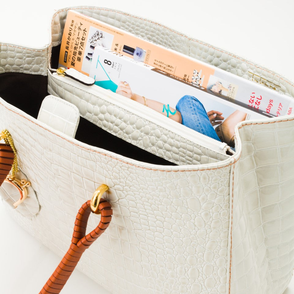 創業から55年以上バッグのアップデートを繰り返してきた鎌倉高野を象徴するアイテムで、おでかけやイベント、通勤で持つ方をエレガントに彩ります。フォーマルバッグを作成する職人の技術から生まれるシンプルながらふっくらと可愛らしいシルエット。贅沢で存在感のある持ち手は、ヌメ革を細く裁断し、一つ一丁寧に巻きあげています。ゴージャスな金具、持ち手と同じ色のステッチなど細かい部分まで作りこみました。意外と収納にも優れており、ファスナー付きの仕切りと携帯・小物仕切りで大事な小物、すぐ取り出したいものを分けて収納できます。大人のオシャレを楽しむ方におすすめのハンドバッグです。A4サイズで、小さなパソコンや書類も収まります。