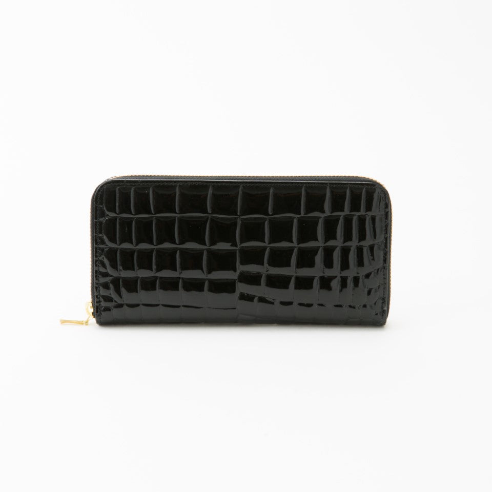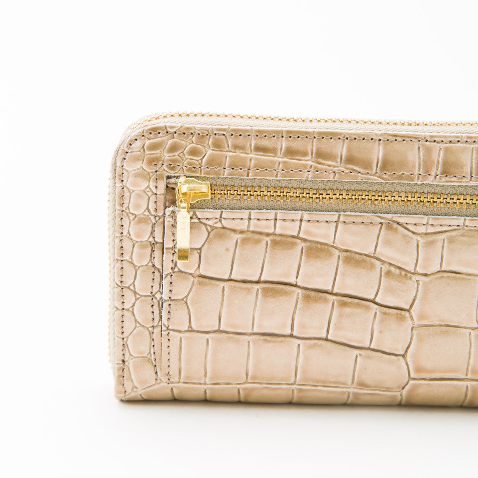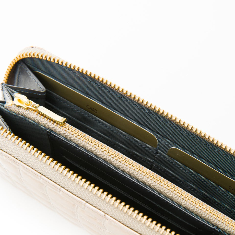 ハンドバッグに使用している革で贅沢に仕上げた財布でプレゼントにもぴったりです。シンプルなデザインながら各所にヘリ返しを加えることでディテールは繊細でエレガントに。ゴージャスなファスナーはちょっとしたアクセントに。小銭入れ、収納スペースが4ヶ所。背ファスナーにICカードを入れるなど使い方は様々。カードを14枚ほど収納できます。