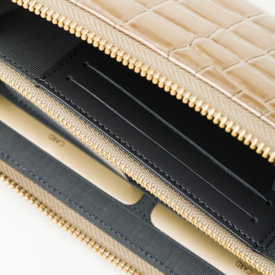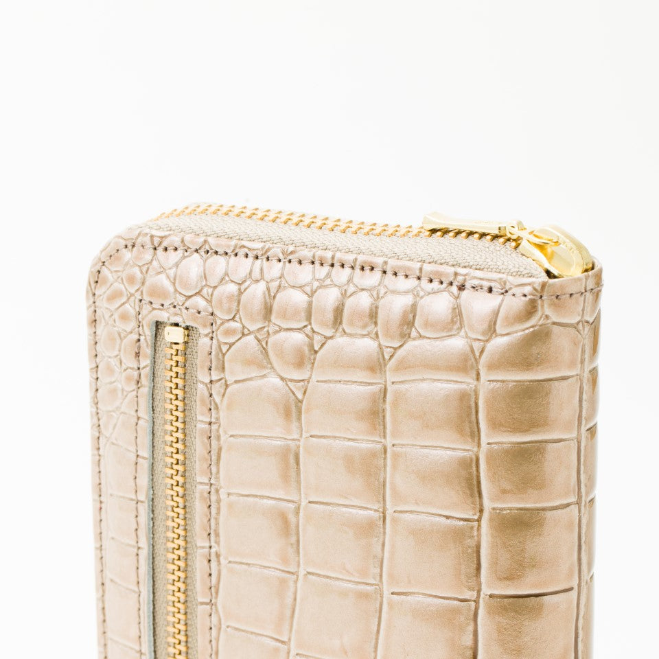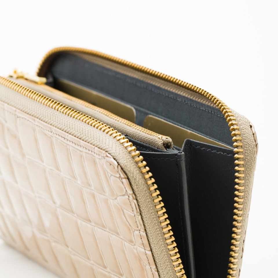 ハンドバッグに使用している革で贅沢に仕上げた財布でプレゼントにもぴったりです。シンプルなデザインながら各所にヘリ返しを加えることでディテールは繊細でエレガントに。ゴージャスなファスナーはちょっとしたアクセントに。小銭入れ、収納スペースが4ヶ所。背ファスナーにICカードを入れるなど使い方は様々。カードを14枚ほど収納できます。