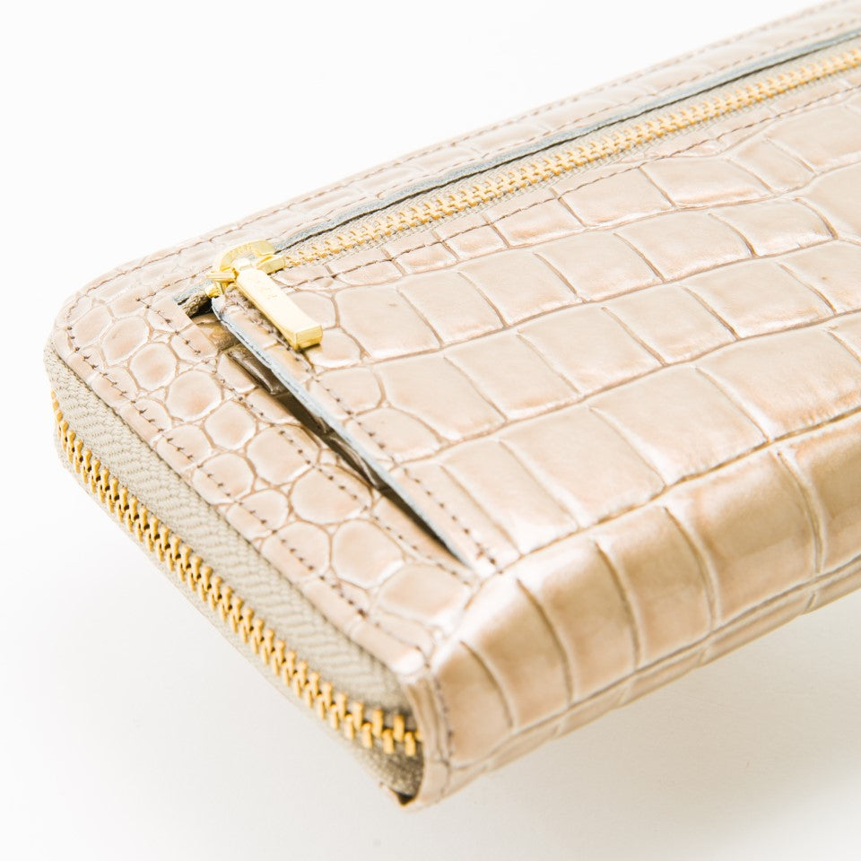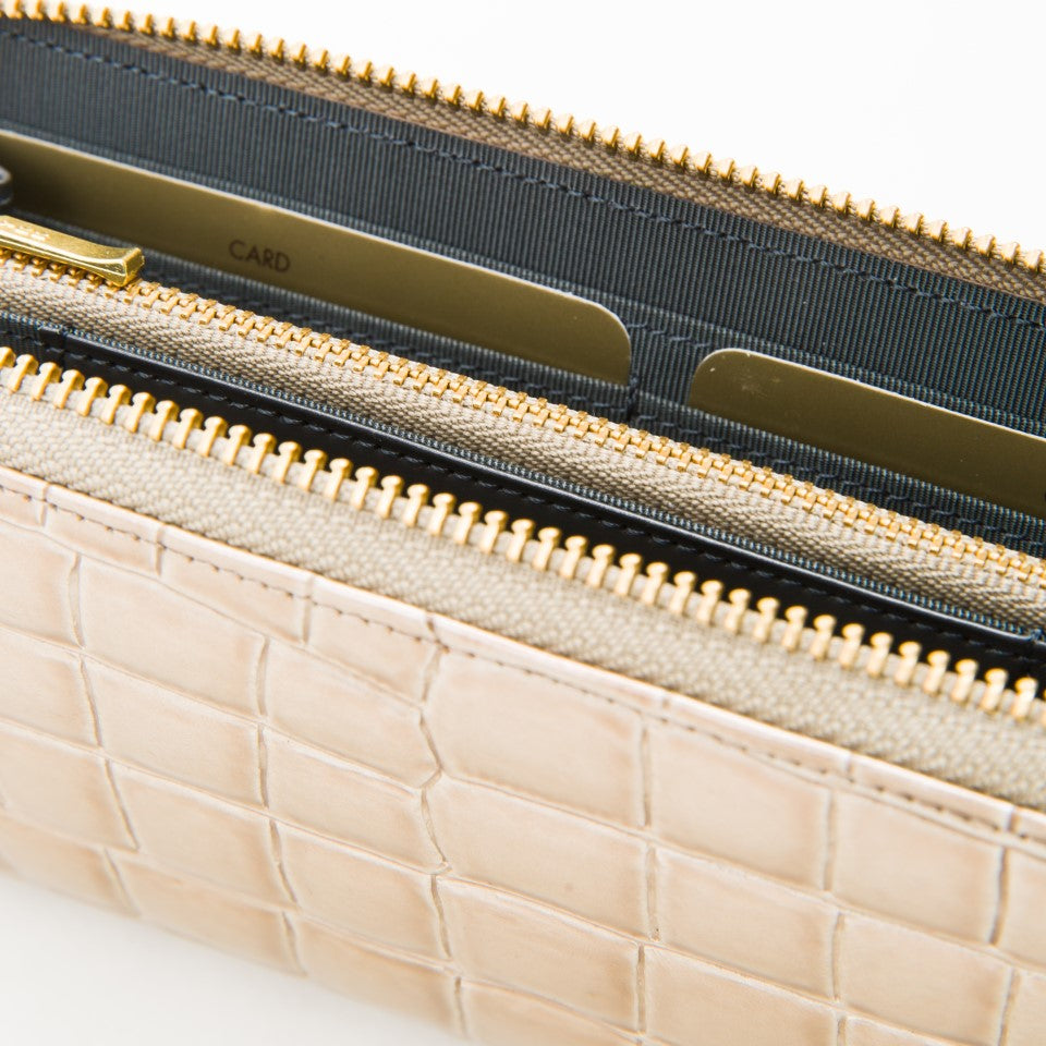 ハンドバッグに使用している革で贅沢に仕上げた財布でプレゼントにもぴったりです。シンプルなデザインながら各所にヘリ返しを加えることでディテールは繊細でエレガントに。ゴージャスなファスナーはちょっとしたアクセントに。小銭入れ、収納スペースが4ヶ所。背ファスナーにICカードを入れるなど使い方は様々。カードを14枚ほど収納できます。