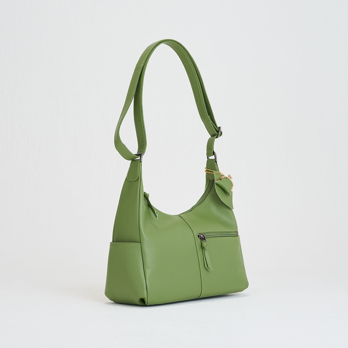 底の四隅はたっぷりマチ巾を取って摘み縫いしているので、十分な収納力がありながら横からのシルエットも柔らかく可愛らしい印象に。調整可能なショルダー紐は、巾2.5センチで肩への負担も軽減しながら、斜め掛けをしたときに身体に馴染む設計になっております。機能のこだわりとしては沢山のポケット。フロント部分には、ワンポイントとして12センチの前ファスナー付き、背中側には16センチのファスナー付き、内側にはオープンポケット2ヶ所、ファスナー付きポケットが1ヶ所に。両サイドにもスマホが入るくらいの大きさのオープンポケットがついています。