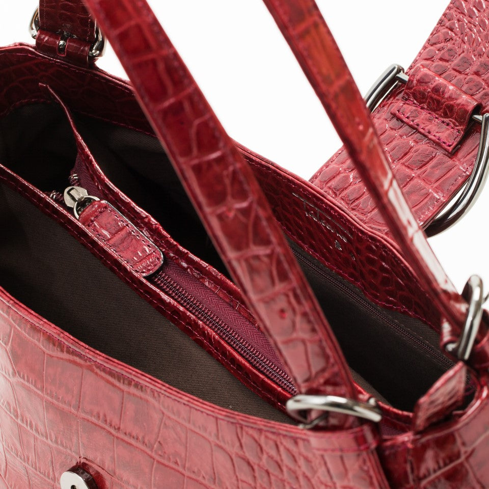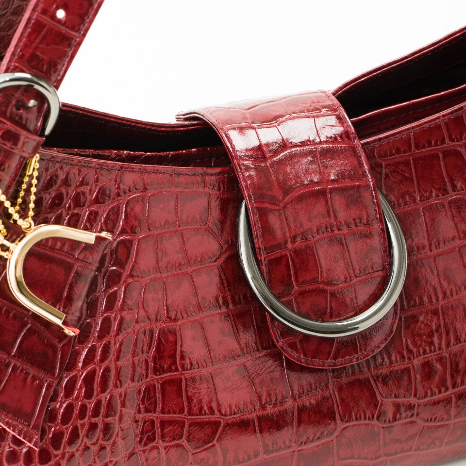 牛革ポロサススモールクロコの型押し 上品なアンチック仕上げ。最上級のマットレザーです。 肉厚の革にリアルクロコの型をギュッと押し、しっかりとした凹凸を出しています。最大のポイントは職人さんによる「頭ハリ」という手塗りの作業で、艶のあるアンティーク風のカラーが生まれます。経年変化に強い特殊な加工を施しているため、傷に強く、はっ水性があり、日常使いにも適しています。