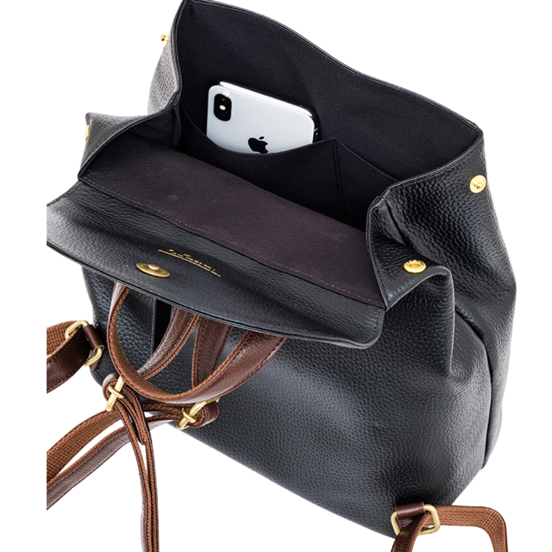 可愛らしいカジュアルな見た目の中に職人の技術とこだわりが込められています。箇所にヘリ返しを施したボディは驚くほどの軽さとソフトな手触りです。カバーはマグネット式、前部のダブルファスナーのポケットはそれぞれ別に収納いただけます。サイドのホックを外すと、収納力がもう一段アップ。ショルダーの取り付けは背中とリュックの空間が空かないようクロスさせ、ショルダー裏をコットンにしていますので、滑らず疲れを軽減します。大人可愛いバックパックでお出かけをお楽しみください。