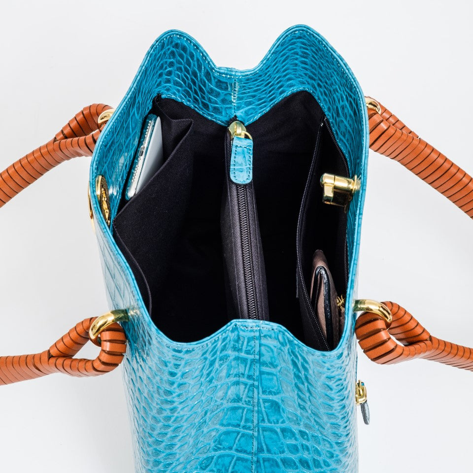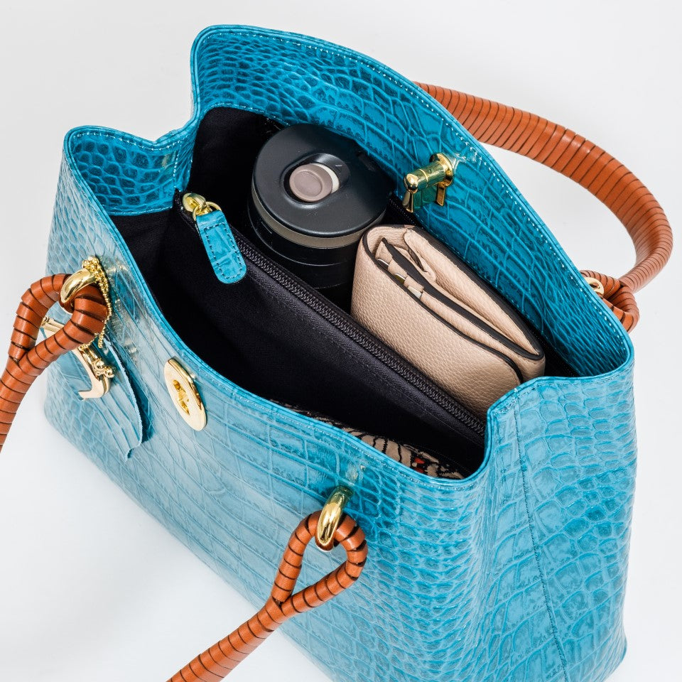 エレガントさと使い勝手が共存する豪華なハンドバッグです。贅沢で存在感のある持ち手とゴージャスな金具がアクセントに。職人の手によってエレガントな曲線に作りこまれたボディは全ての箇所にヘリ返しを施しており、驚くほどの軽さとソフトな手触りです。持ち手は、ヌメ革を細く裁断し、一つ一丁寧に巻きあげています。ファスナー付きの仕切りと携帯・小物仕切りで大事な小物、すぐ取り出したいものを分けて収納できます。大人のオシャレを楽しむ方におすすめのハンドバッグです。