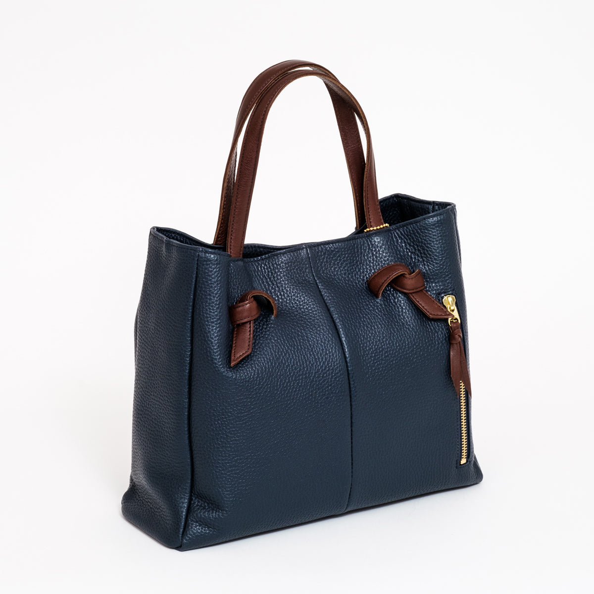 シンプルなボディへ丁寧にヘリ返しを施し、ヴィンテージ感のあるチョコ革とポップなシュリンクカラーのバイカラーが特徴のハンドバッグです。特長となる可愛らしいリボンのような手紐は、贅沢に革一枚を使って、キュッと結んでいます。前部の金属製ファスナーで少しアクセントを施しました。口元はマグネットを使用し、中仕切りはホックで取り外し可能です。マチもあり、収納力も抜群です。