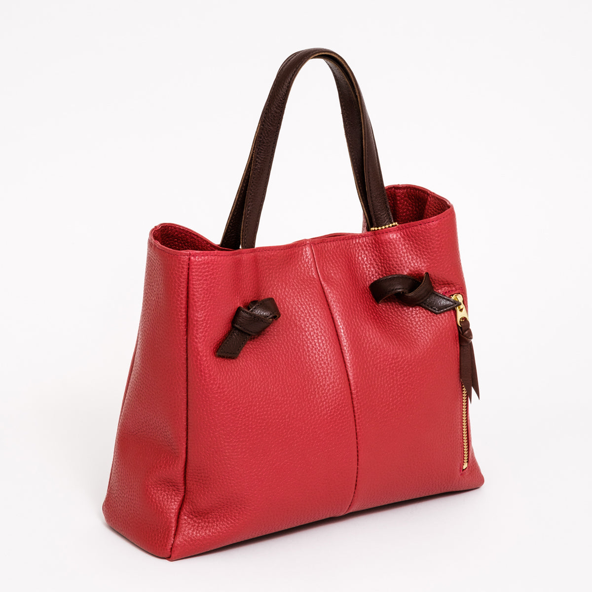シンプルなボディへ丁寧にヘリ返しを施し、ヴィンテージ感のあるチョコ革とポップなシュリンクカラーのバイカラーが特徴のハンドバッグです。特長となる可愛らしいリボンのような手紐は、贅沢に革一枚を使って、キュッと結んでいます。前部の金属製ファスナーで少しアクセントを施しました。口元はマグネットを使用し、中仕切りはホックで取り外し可能です。マチもあり、収納力も抜群です。