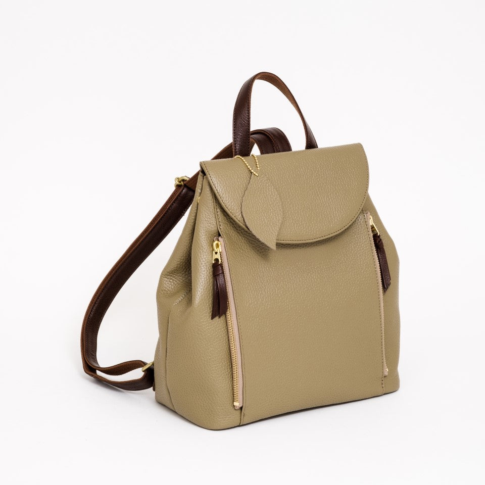 可愛らしいカジュアルな見た目の中に職人の技術とこだわりが込められています。箇所にヘリ返しを施したボディは驚くほどの軽さとソフトな手触りです。カバーはマグネット式、前部のダブルファスナーのポケットはそれぞれ別に収納いただけます。サイドのホックを外すと、収納力がもう一段アップ。ショルダーの取り付けは背中とリュックの空間が空かないようクロスさせ、ショルダー裏をコットンにしていますので、滑らず疲れを軽減します。大人可愛いバックパックでお出かけをお楽しみください。