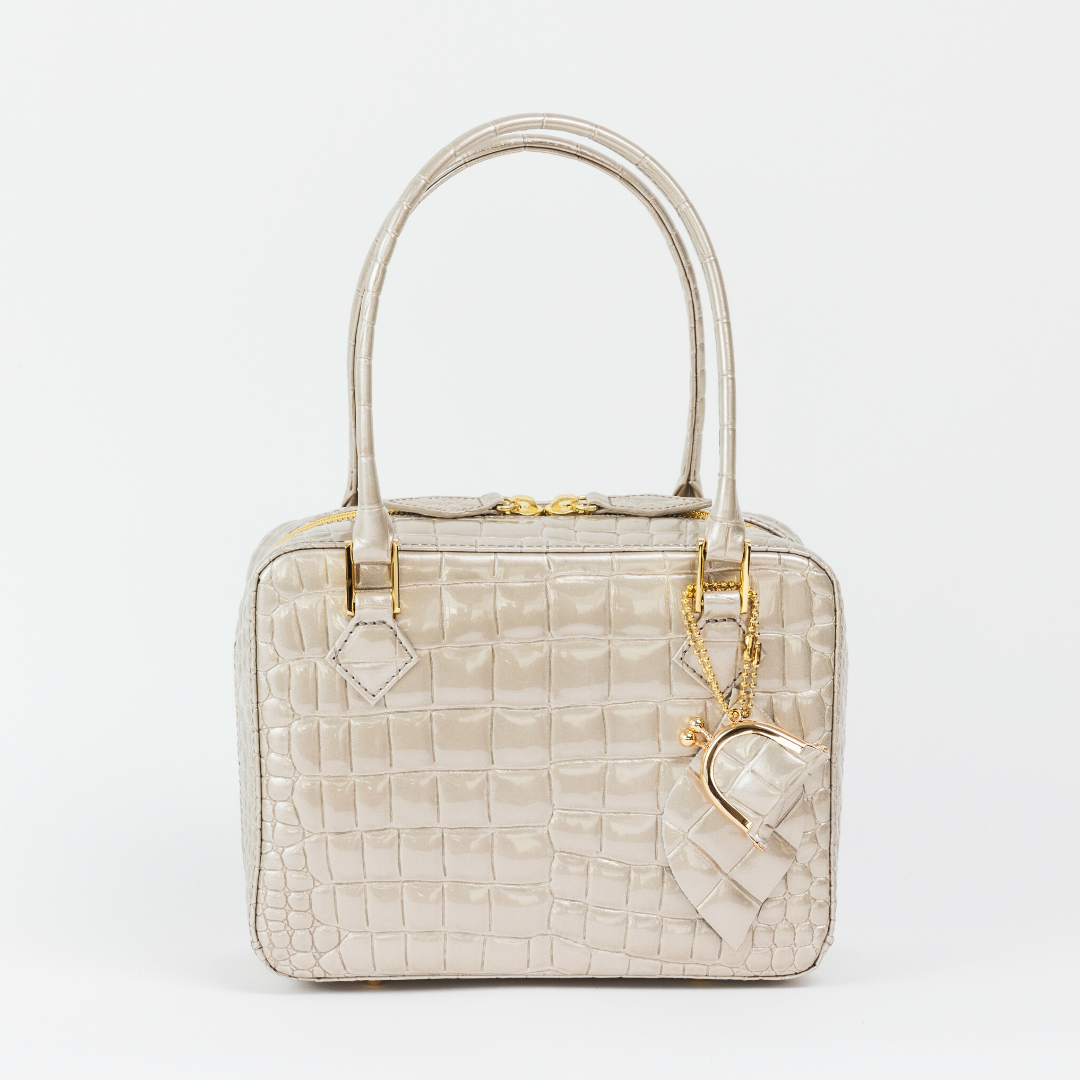 牛革ポロサススモールクロコの型押し 上品なアンチック仕上げ。最上級のマットレザーです。 肉厚の革にリアルクロコの型をギュッと押し、しっかりとした凹凸を出しています。最大のポイントは職人さんによる「頭ハリ」という手塗りの作業で、艶のあるアンティーク風のカラーが生まれます。経年変化に強い特殊な加工を施しているため、傷に強く、はっ水性があり、日常使いにも適しています。