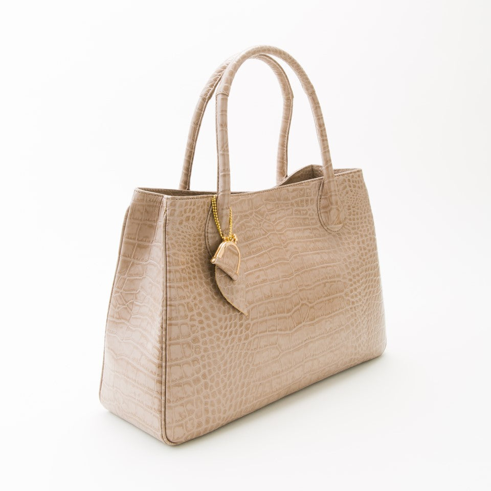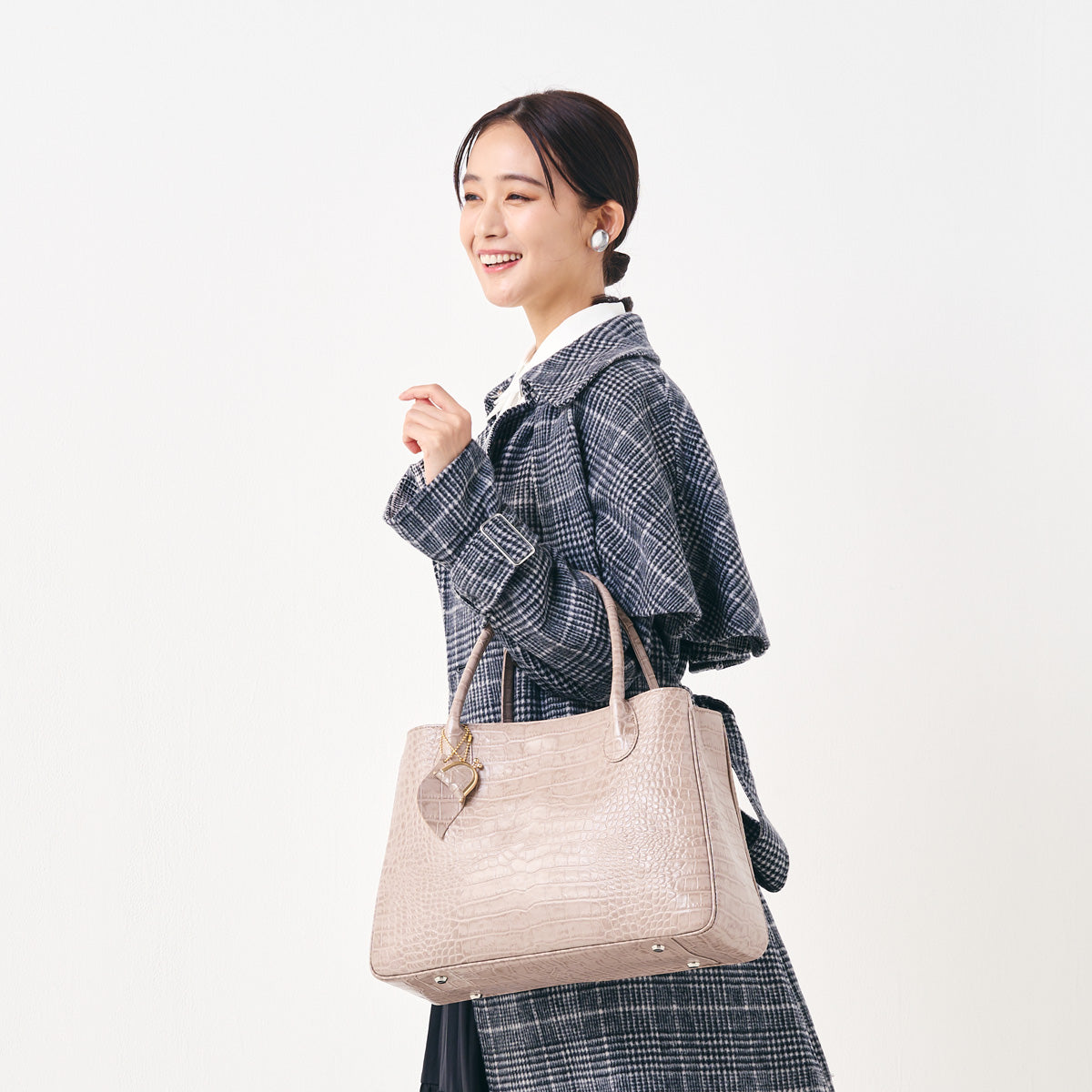 創業から55年以上アップデートを繰り返し、累計15,000個以上販売されてきた人気アイテムです。バッグを持つ方をエレガントに彩り、サポートするため多くの工夫を施して参りました。各所に丁寧に漉いた革の断面を折りたたんで縫い込む、ヘリ返しの技術を用い、軽さと耐久性を両立しソフトな手触りを実現。マチを独立して裁断・縫製することでお荷物を入れてもシルエットは保たれ、型崩れしません。口元に引っ掛け金具は、重いものを入れても開かず、倒してしまっても安心です。中仕切りは、取り外してクラッチバッグとして。大きな荷物などを入れる際には端に付け替えられます。オン・オフどの様なシーンでもご利用いただけるトートバッグです。A4サイズで、小さなパソコンや書類も収まります。