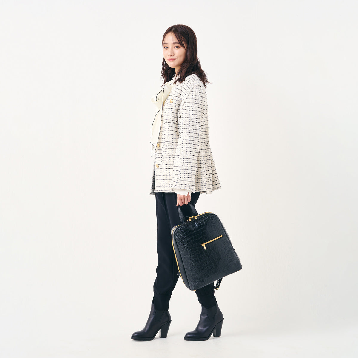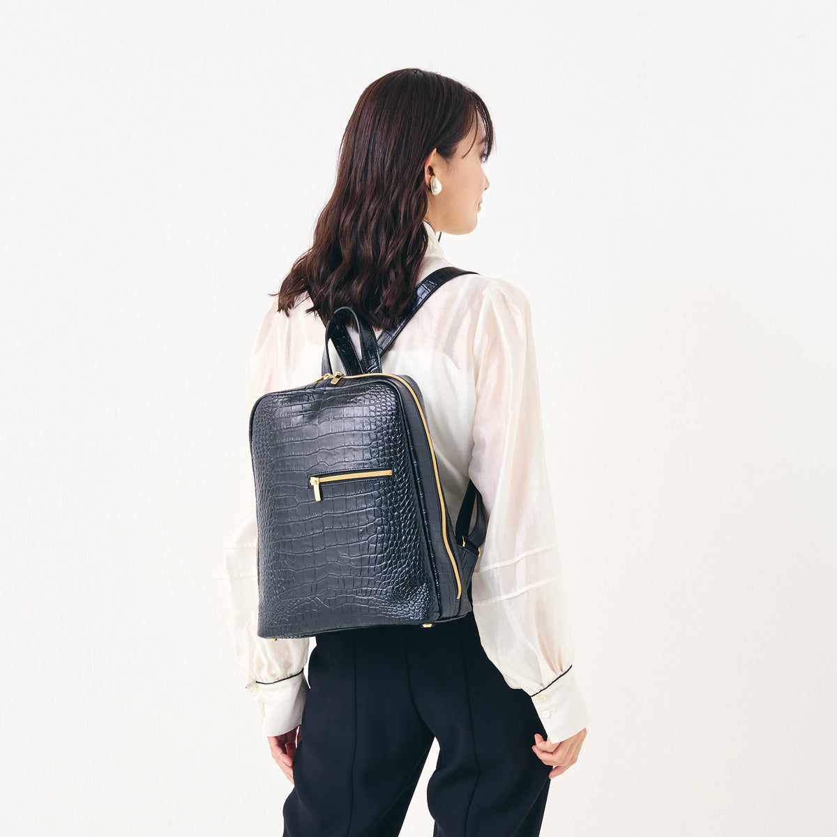 お客様からの声と理想が現実となったエレガントなバックパックです。A4書類が縦に収まるスクエアなボディに職人の技術とこだわりが込められています。手作りから生まれる角を丸くしたエレガントなフォルム。ショルダーは背中とリュックの空間が空かないようクロスさせ、裏をコットンにすることで滑らず疲れを軽減できます。滑らかに開閉できるファスナーは特注のナイロン製で、荷物を出し入れする際に物を傷つけません。ファスナー付きの仕切りは、あえて下を縫い込んでいないので物を分けて収納いただきつつ、お弁当箱など大きなものも収納いただけます。オン・オフどの様なシーンでもご利用いただけるバックパックです。