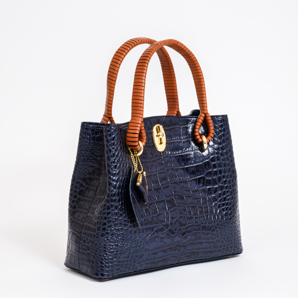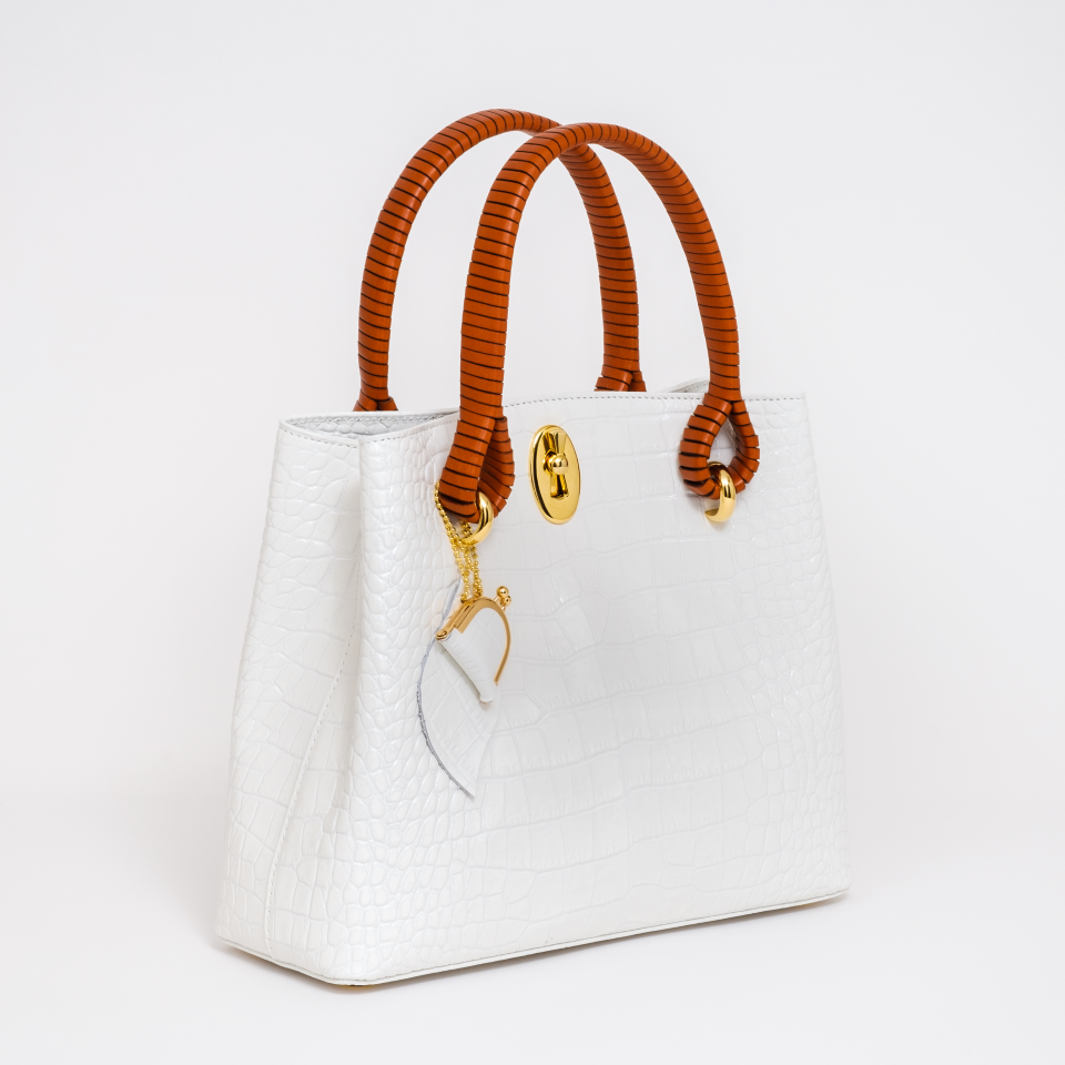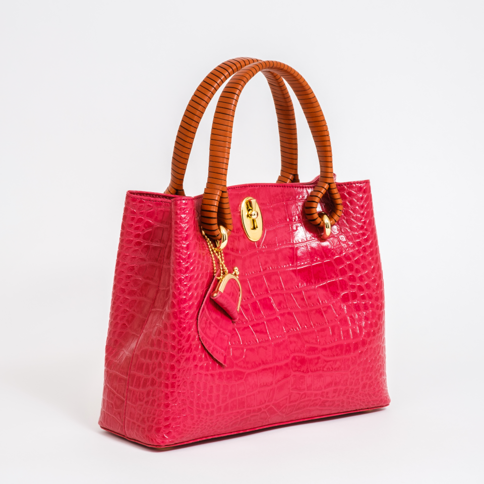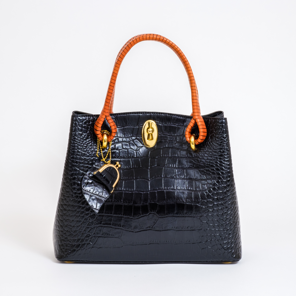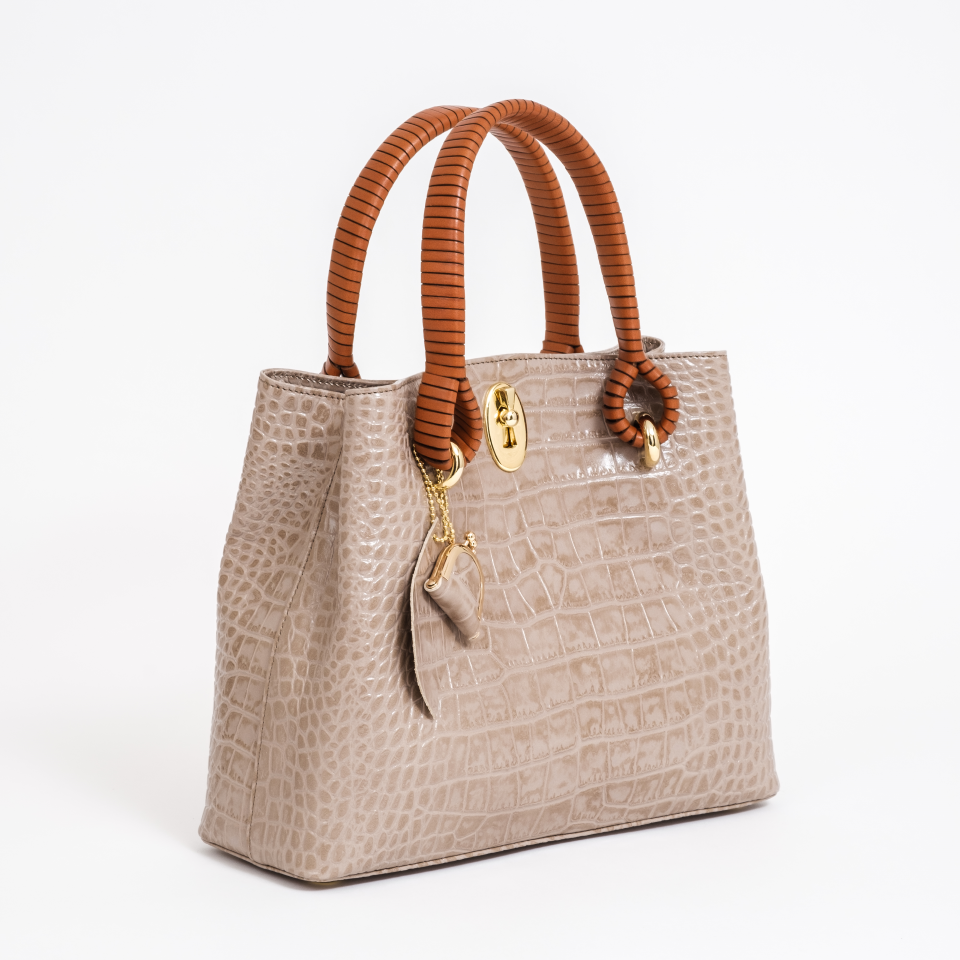 エレガントさと使い勝手が共存する豪華なハンドバッグです。贅沢で存在感のある持ち手とゴージャスな金具がアクセントに。職人の手によってエレガントな曲線に作りこまれたボディは全ての箇所にヘリ返しを施しており、驚くほどの軽さとソフトな手触りです。持ち手は、ヌメ革を細く裁断し、一つ一丁寧に巻きあげています。ファスナー付きの仕切りと携帯・小物仕切りで大事な小物、すぐ取り出したいものを分けて収納できます。大人のオシャレを楽しむ方におすすめのハンドバッグです。